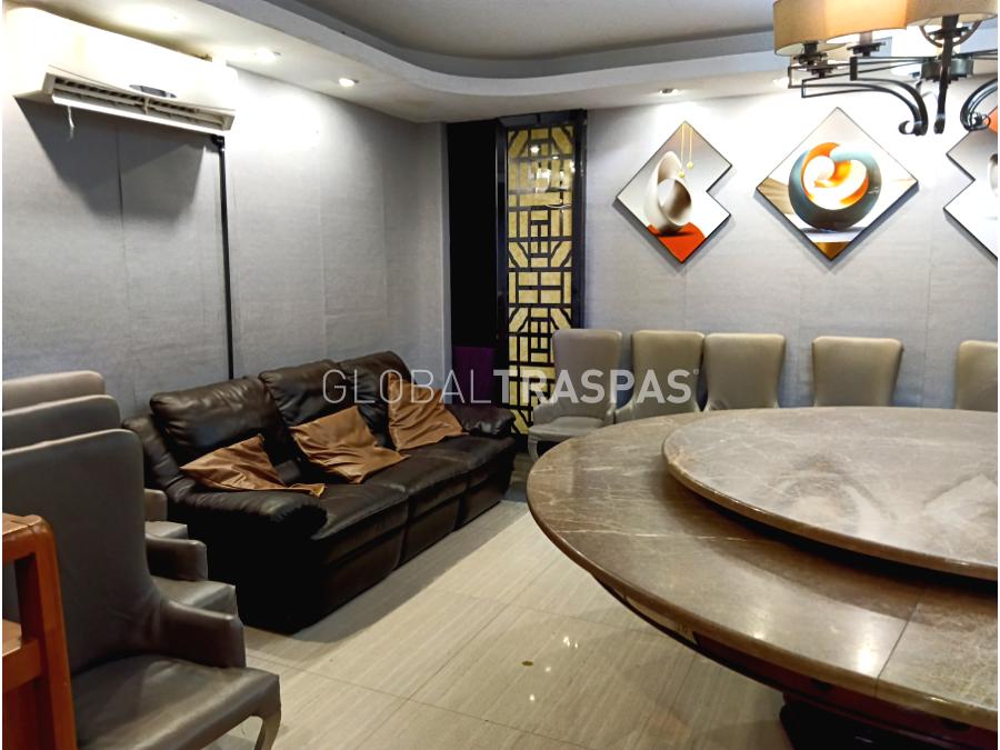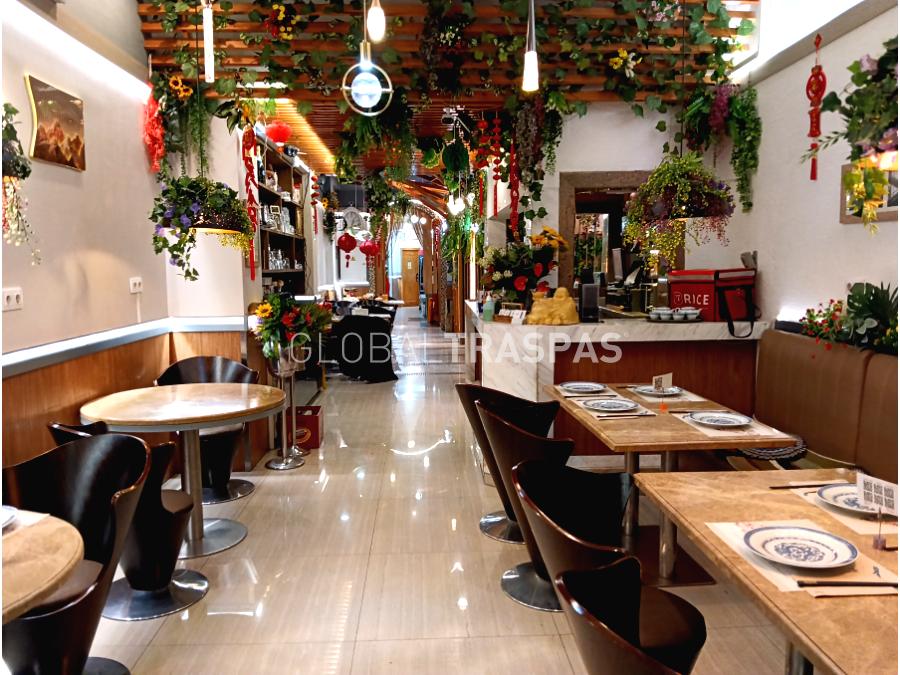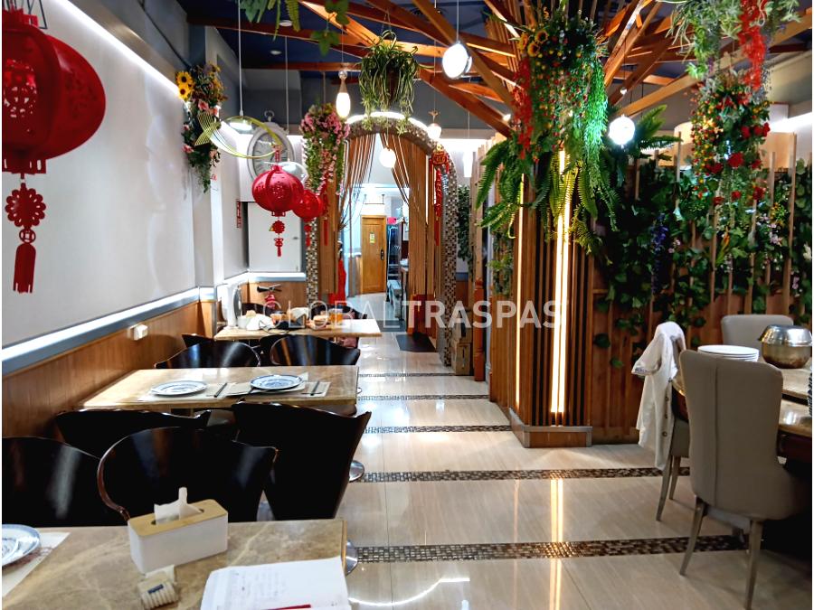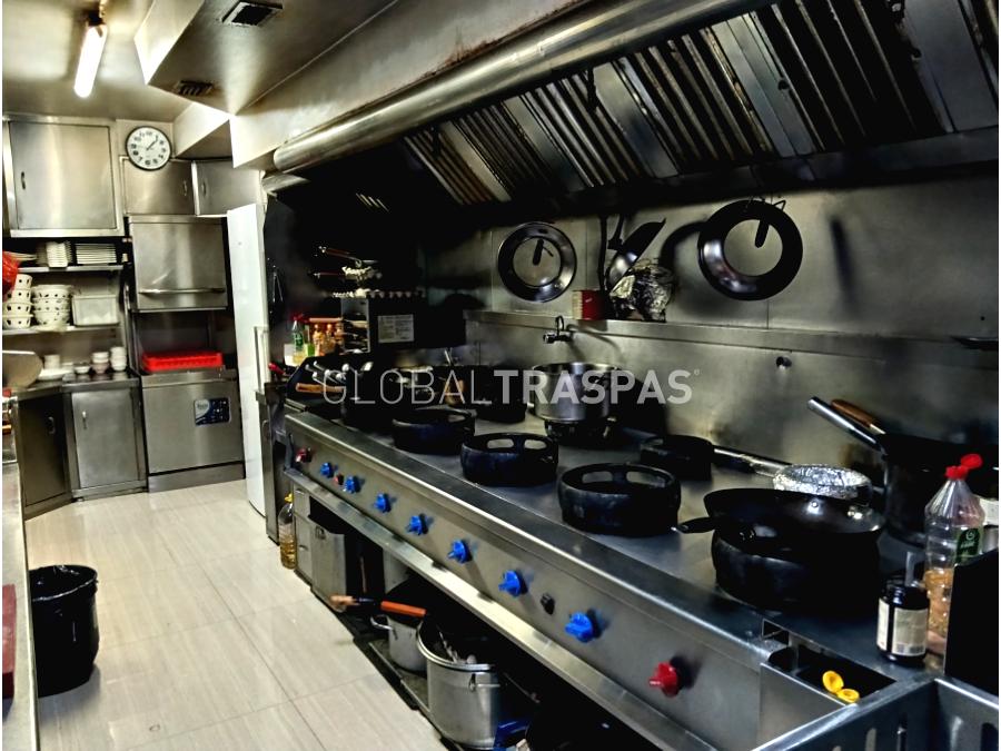 Ref. T-3125-02 Se traspasa Bar Restaurante con licencia C3 de 280m2 distribuidos en 2 plantas, fachada acristalada de 3,5 metros,1 entrada y 123 comensales. Barra de 5 metros equipada con máquina registradora TPV y lavavasos. La cocina de 20m² completamente acondicionada con salida de humos, 7 neveras, 9 congeladores, horno, microondas,9 fogones a fuego a gas (wok), salamandra, parrilla y lavavajillas. El local cuenta con 4 tv, 5 aseos (uno adaptado), almacén y aire acondicionado.