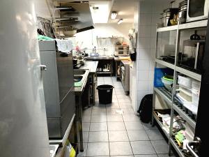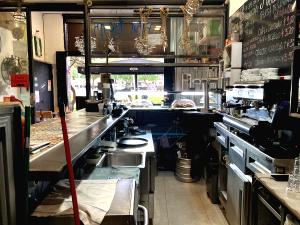Consta de una barra de 4 metros en forma de L, equipada con cafetera (de proveedor), máquina registradora tpv, nevera de 3 puertas, vitrina expositora, lavavasos, contrabarra de 1,5 metros con 3 taburetes y máquina de hielo, y en la zona office encontramos nevera, 2 congeladores Arcones y 3 verticales, microondas y plancha.