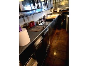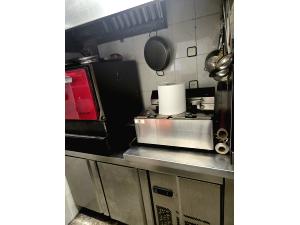 La cocina de 6m completamente acondicionada vista con salida de humos, nevera 2 puertas, 2 freidoras eléctricas, horno Josper, horno eléctrico, microondas, nevera vertical y Fregadero.