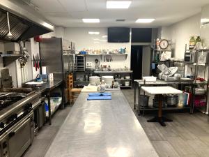 La cocina de 60m² se encuentra completamente acondicionada con salida de humos, 8 neveras, 4 congeladores, horno de piedra a gas, horno eléctrico, 1 freidoras de gas, 8 fogones a fuegos, 2 microondas y lavavajillas. Hay 2 salidas de humos independientes, pero solo usan una, la otra está cerrada.
