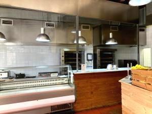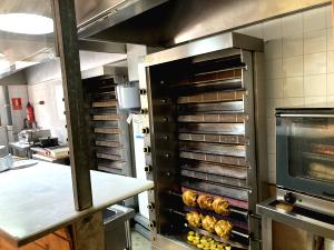 La cocina vista en barra de se encuentra completamente acondicionada con salida de humos de 50cm de diámetro, 2 neveras, 2 congeladores, horno, 2 asadoras de pollo de gas, 2 freidoras de gas pequeñas y una freidora industrial 2 cuerpos de 50 litros cada uno.